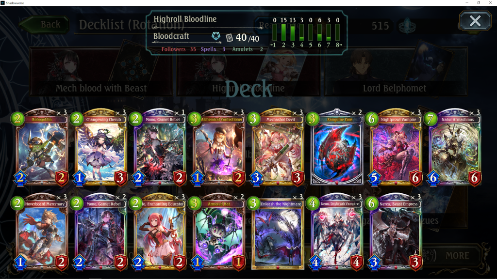 These 3 are the most important tutor in the deck. They search out important cards in the deck and are often kept in mulligans regardless who goes first or second. Confectioner is important because she guarantees you 2 of the 3 cards, Cherub, Nightprowl and Al’Machinus. She is your bread and butter to enable your turn 7 Al’Machinus’ turn since she adds a Natura trait and even Al’Machinus himself. Adding Nightprowl is not a big thing since she herself is a Natura that can fuse to Al’Machinus but you will just use her to trigger Nerea. You want to play Confectioner on 3 to thin out your deck. She has a weak body and an awkward cost so you want to play her out as soon as possible to avoid weak plays on your later turns but you can consider playing her on turn 5 in hopes of tutoring Nightprowl, allowing you to play Nightprowl’s crystallize on the same turn. Unleash the Nightmare has been a consistent card in almost every blood deck. This card is another bread and butter as you get 2 random follower and 2 1|1 follower which could be mechs if you’re lucky. This allows you to randomly tutor any card and even if you hit mech cards, you get free mech followers to help with your mech destroyed count. The question is, on turn 3 do you play Confectioner or Unleash? Honestly both are fine but Unleash does give you the option to tutor out mech and produce mechs that can be used as a fodder for Neun. Confectioner on the other hand allows you to avoid weak play on later turns because Unleash is still a strong play compared to Confectioner. Ultimately it depends on what you need in the game itself. Consider the following, is Unleash on 3 going to push more damage? Is there a necessary play on turn 4-5 which blocks you from play Confectioner? How desperate do you need the cards that Confectioner’s tutor in this match up? Are you looking for cards other than Confectioner’s tutor pool? Nightprowl’s main purpose is to trigger Nerea’s free evo. She tutors Natura and is a Natura herself which is very neat since she can self tutor to filter your deck for better draws on later turns. The only bad thing about her is that her follower effect is not that great so getting her with Al’Machinus might hurt your chances of winning. In that case, you want to play all 3 Nightprowl to avoid that from happening, that is why people often play her on turn 1 even if it is better to save her to trigger Nerea. You can still get her back from her own effect or the other 2 powerful tutor we talked about before. The only consideration for keeping her after Al’Machinus turn is to trigger Nerea but then again you have a 2nd option (0 cost Hoverboard Mercenary) and you can even trigger Nerea on turn 9 with the mentioned tutors above. In general you try to thin out all your Nightprowl because you will only trigger Nerea on turn 6 in most cases but you can consider keeping Nightprowl on later turn if you deem it necessary.